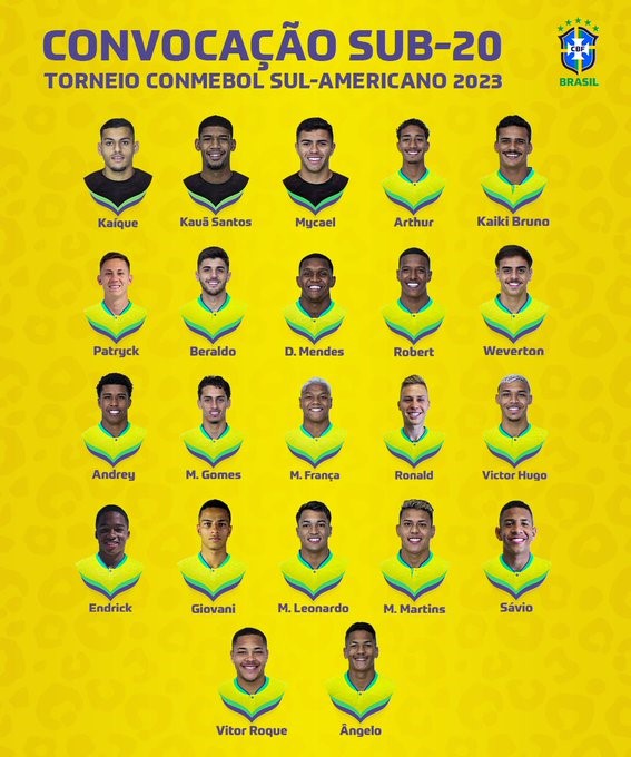 Atacantes: Endrick (Palmeiras), Giovani (Palmeiras), Marcos Leonardo (Santos), Matheus Martins (Fluminense), Sávio (PSV), Vitor Roque (Athletico-PR) e Ângelo (Santos).